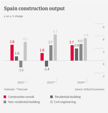 Construction output in Spain is forecast to grow by just 1.8% in 2023, as interest rate increases hamper building projects across all subsectors. The residential construction segment will contract as a combination of higher interest rates and lower disposable household incomes negatively affect access to affordable mortgages. While the Next Generation EU fund will support large investments in projects with a sustainability aspect, its implementation has been slower than expected so far.