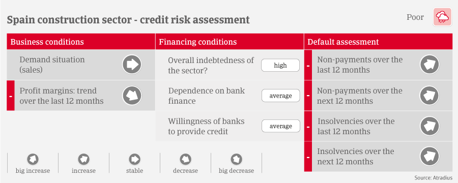 Due to the subdued credit risk situation, cost pressure and weaker demand for residential construction we assess the sector as “Poor”. Shortage of skilled workforce will remain an issue in the mid-term, with the National Confederation of Construction estimating that Spain requires about 700,000 construction workers during the next couple of years.